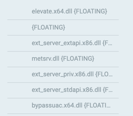 The attackers use a Meterpreter implant to carry out post-exploitation actions. The Cybereason Platform detects both the shellcode and various Meterpreter DLLs reflectively loaded to memory. The detected DLLs include: