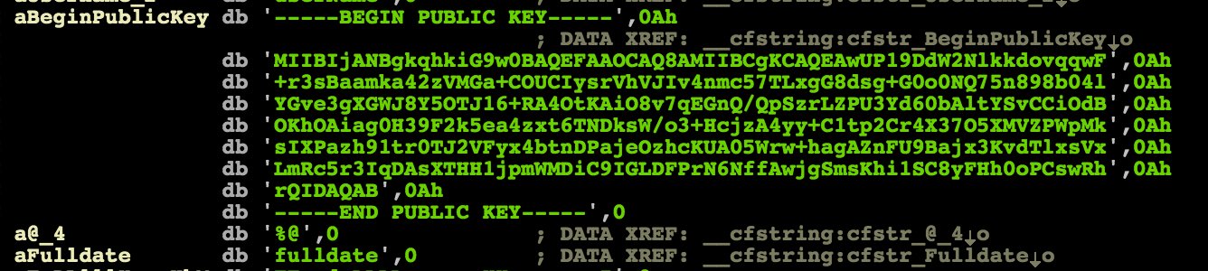 When looking at the strings section of activity_agent in IDA pro, we immediately spot a public key.