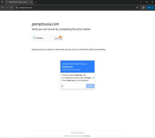 While appearing as a human verification step, the page employs navigator.clipboard.writeText(nE.command) to copy a malicious command to the user's clipboard. It then displays instructions, prompting the user to paste and execute it via the Windows Run dialog box (Win + R).